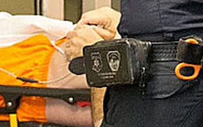 First, there are photos of Jeffrey Epstein being taken from the Metropolitan Correctional Center by NYFD, and in one of those photos most of Epstein’s face is clearly visible. In that photo several things immediately jumped out at us first of which is that Epstein was wearing orange prison pants and an orange prison shirt (which you can see bunched up at the base of his neck) which tells us that he did not hang himself with his own garments.