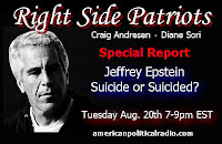 Tuesday, August 20th from 7 to 9pm EST on American Political Radio, RIGHT SIDE PATRIOTS Craig Andresen and Diane Sori present their Investigative Report: ‘Jefftrey Epstein…Suicide or Suicided?.’ This is one show you do not want to miss.