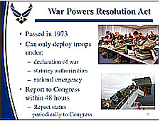 By the letter of the Resolution, not the law, it stipulates that a U.S. President can undertake military action for a period of sixty days after informing congress of said action within 48 hours of the beginning of said action and forbids armed forces from remaining for more than 60 days, with a further 30-day withdrawal period, without congressional authorization for use of military force (AUMF) or a declaration of war by the United States.